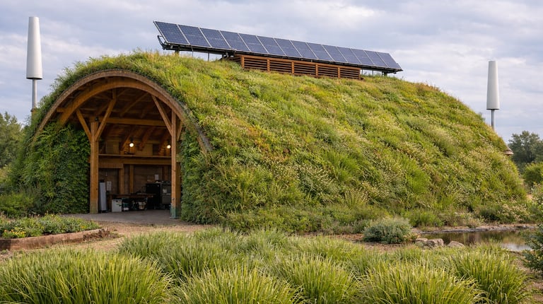Materiales: Muros de adobe (arcilla y paja) de 50 cm de espesor, estructura de madera, cubiertas vegetales (techo vivo).