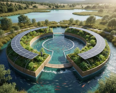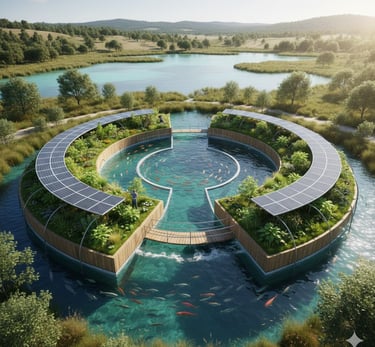 Un diseño en forma de Donut con todas las herramientas necesarias para que la piscifactoría sea eficiente. Un sistema que ayude a que el agua esté siempre en movimiento, un buen sistema de aire y de traspaso entre piscinas. El sistema acuático tendrá un proceso continuo de limpieza de aguas utilizando filtros naturales y Bio-digestión. Hay que buscar un equilibrio de unidades dependiendo de nuestra capacidad de captación de aguas pluviales.