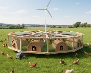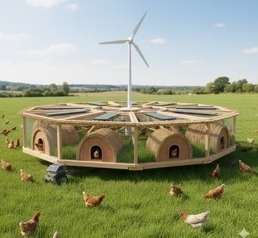 Gallinero móvil rotatorio para no castigar los terrenos, recolección de los excrementos y compostaje ajeno al resto para uso propio. Pequeñas construcciones con adobe para la puesta de huevos, del tamaño justo para entrar a limpiar fácilmente.